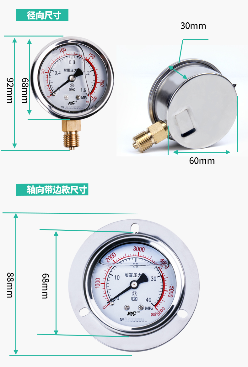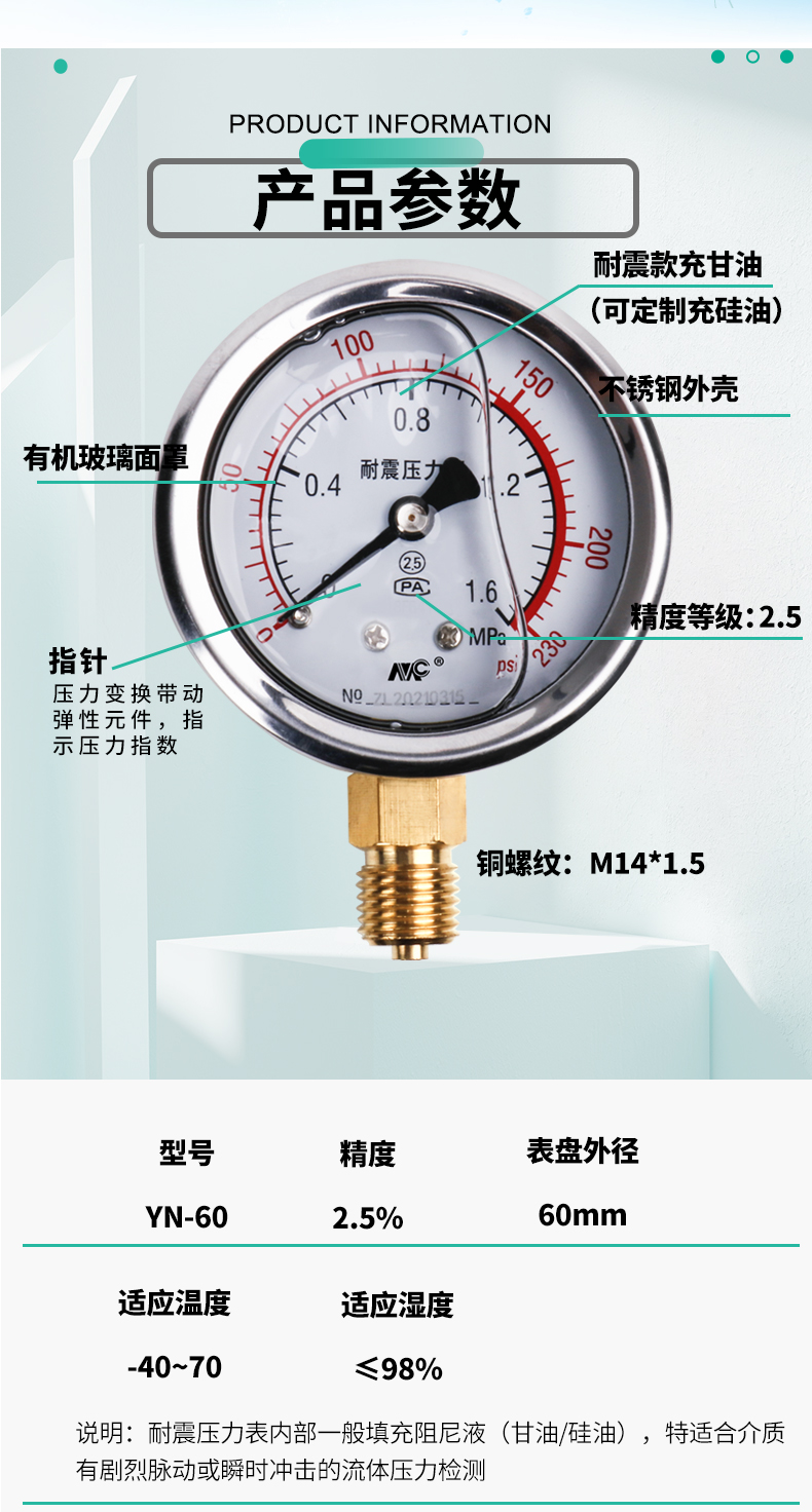 YN60不銹鋼耐震壓力表